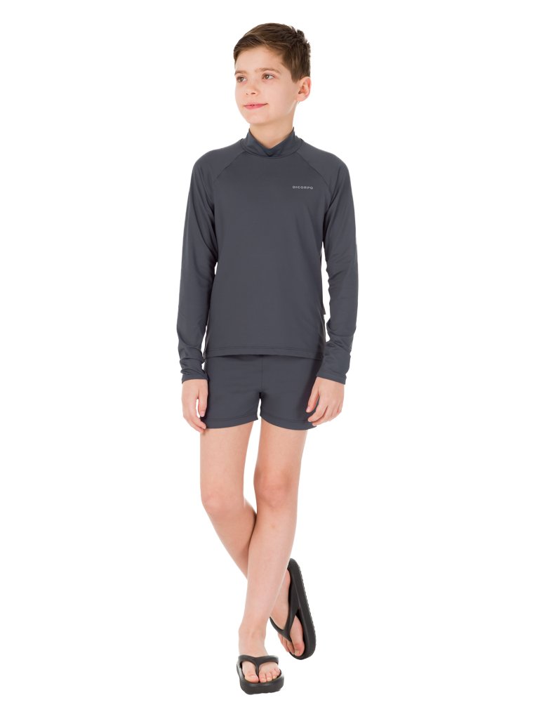 Camiseta Infantil Unissex com Mangas Raglã, Gola Subida, Mullet Curto e Proteção UV