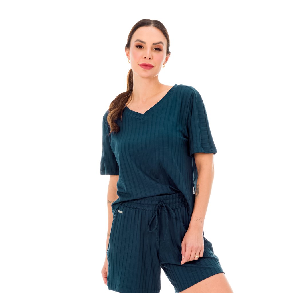Conjunto Recortado: Blusa com Decote V + Bermuda com Elástico e Amarração na Cintura