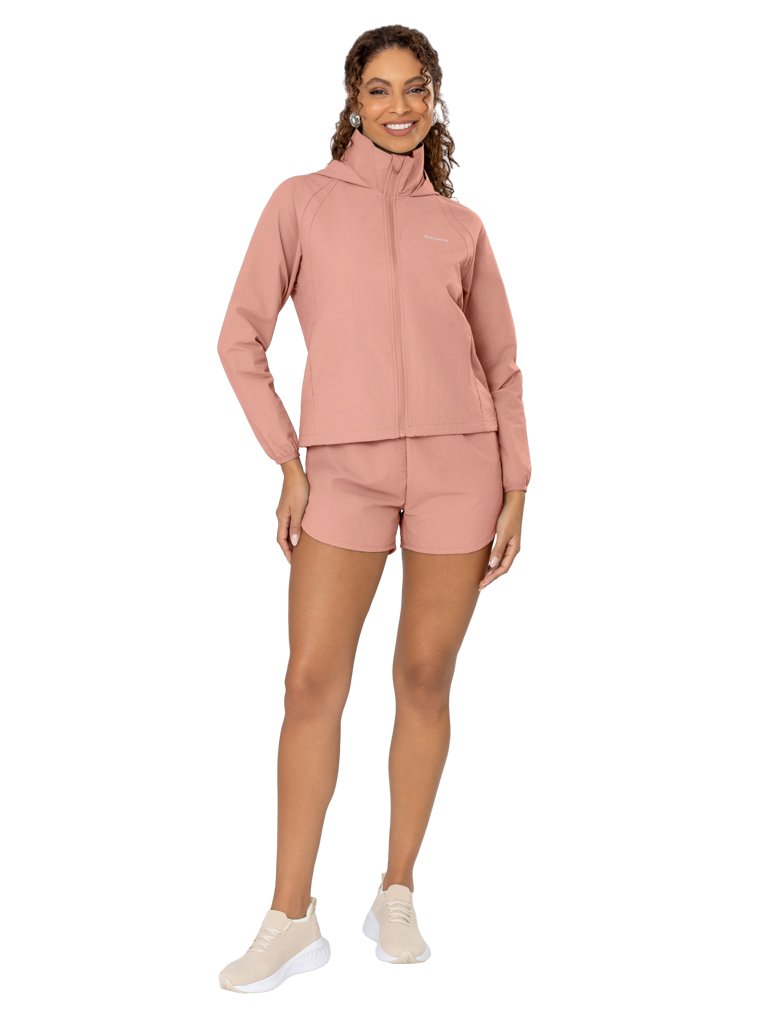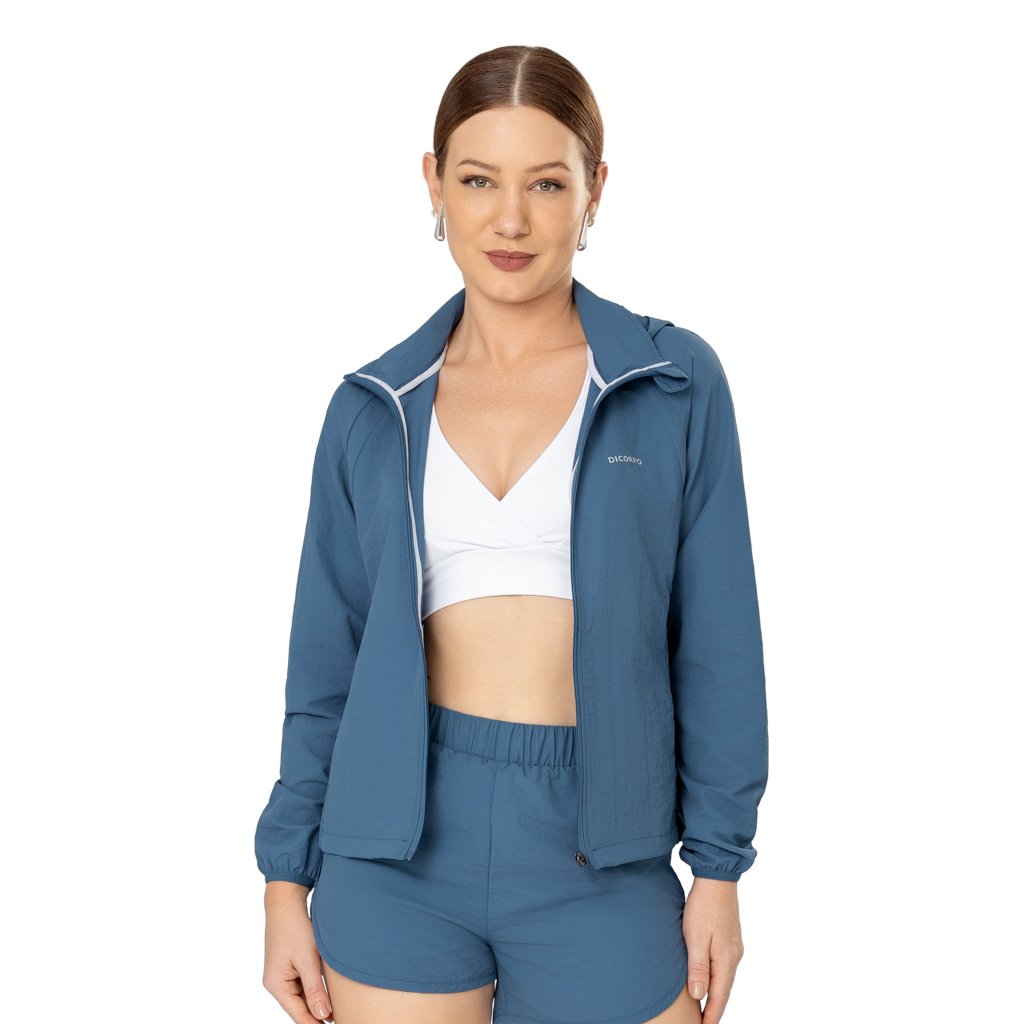 Jaqueta Recortada tipo Corta Vento com Gola Alta, Capuz, Bolsos Embutidos e Ajuste Interno na Barra