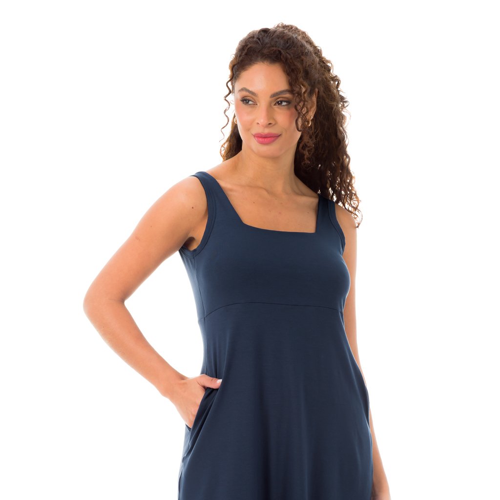 Vestido Recortado com Decote Quadrado, Bolsos, Fenda nas Costas e Bojos Removíveis