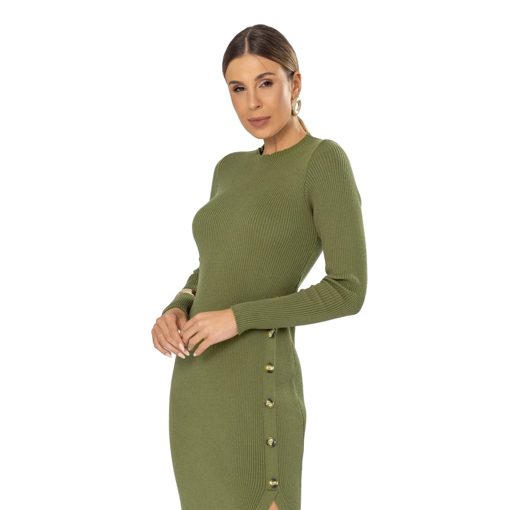 Vestido com Gola Subida, Mangas Longas e Fenda Frontal com Detalhe de Botões